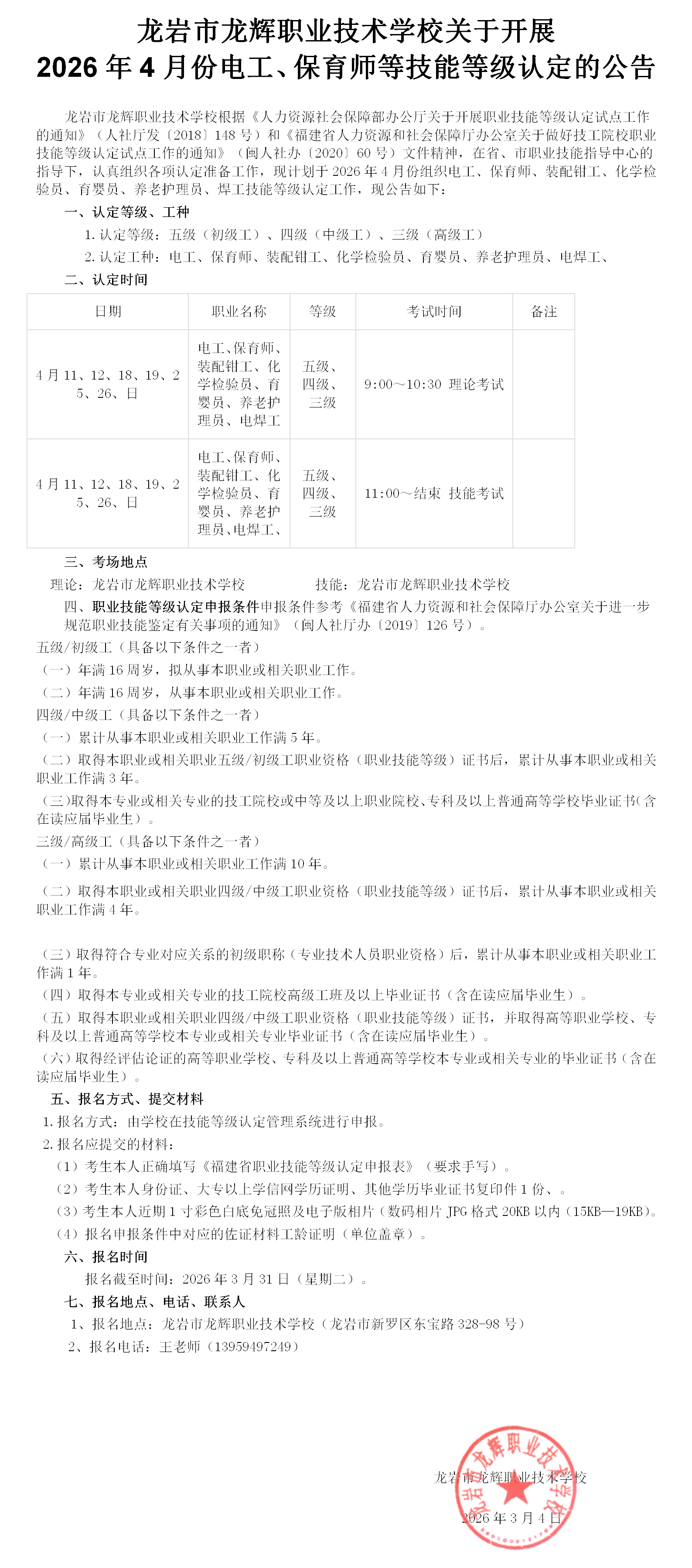 2026年4月份电工、钳工、保育师、化学检验员公示